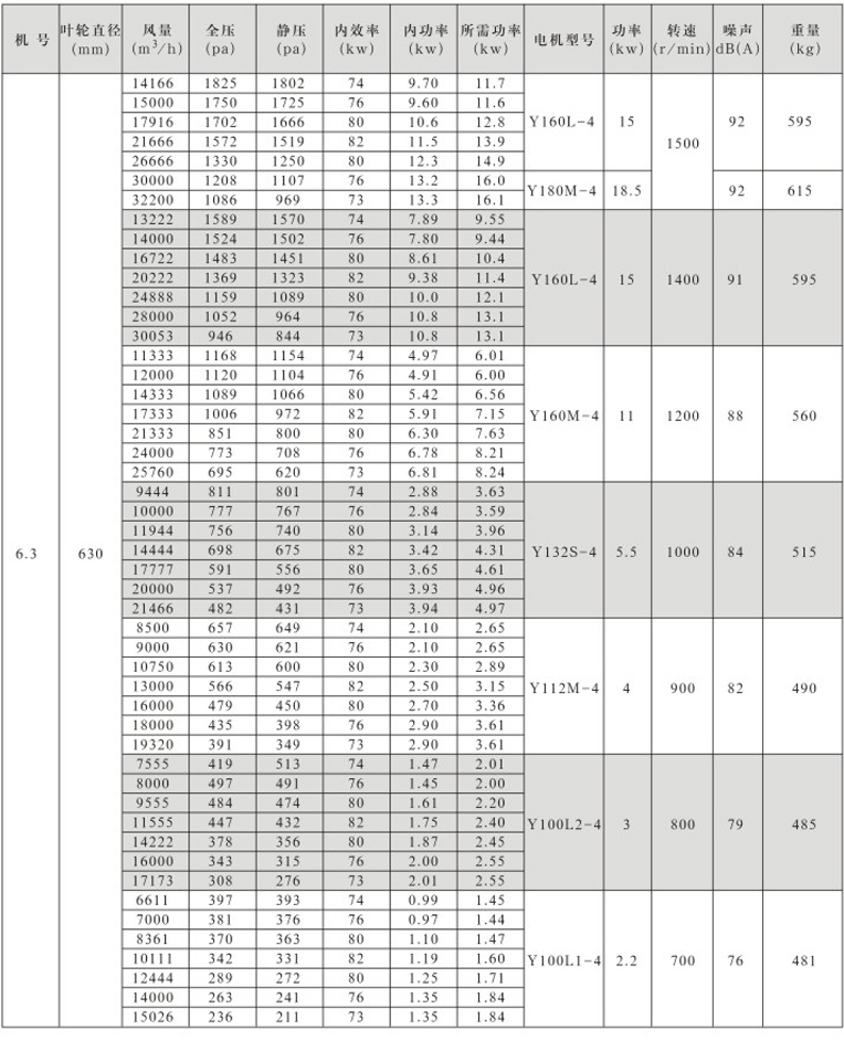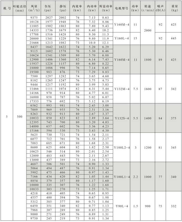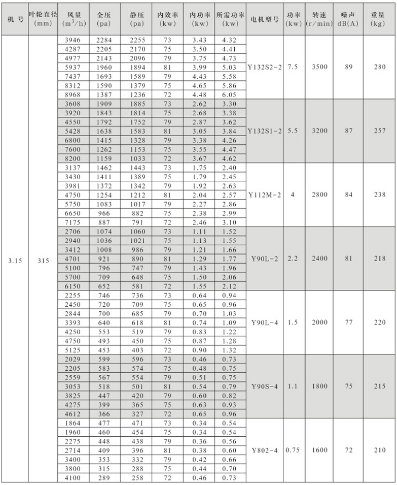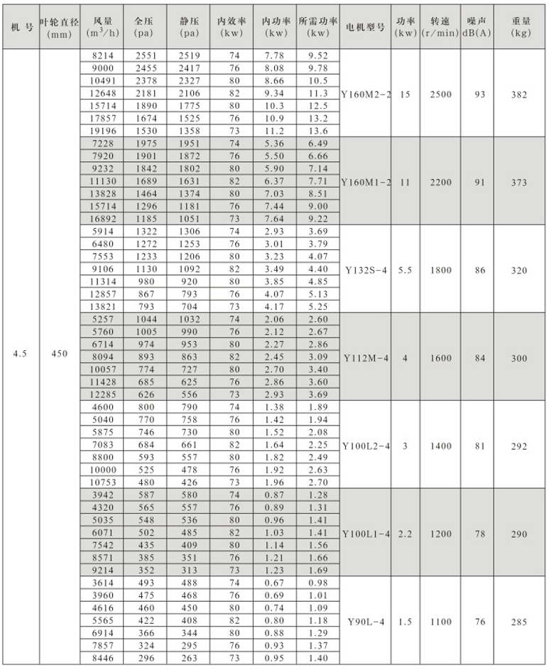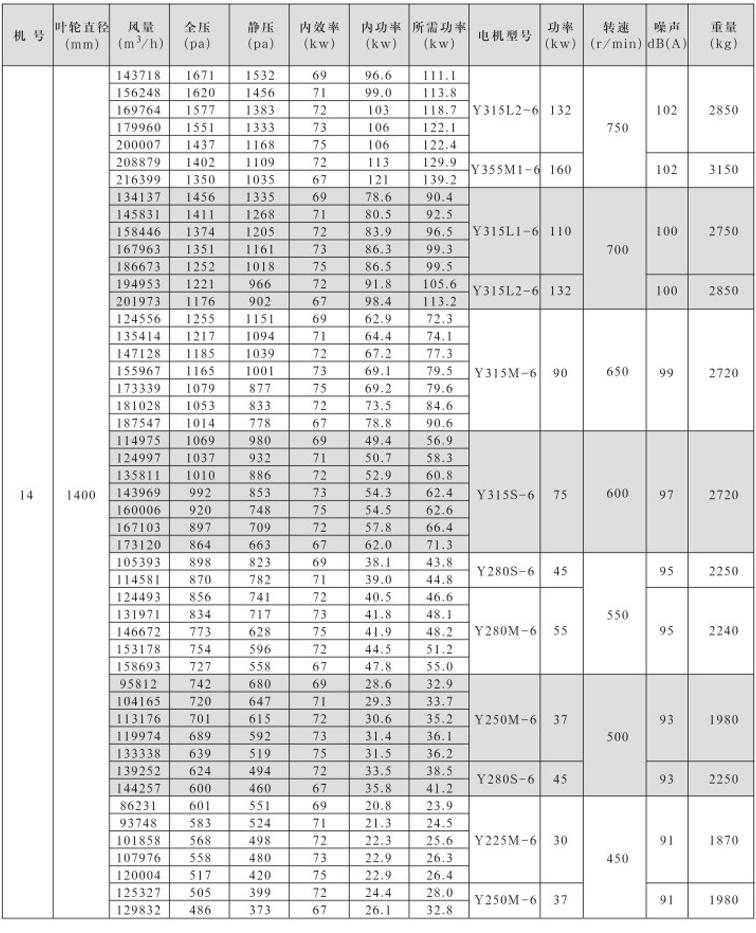 风机按直径分为250~1600mm十七种规格,系列风量为1000~300000m3/h,全压为280~2300Pa。风机分单速和双速,双速风机配用双速电机,实现两档调速,可满足用户对不同工况点性能调节的需要,风机也可配用变频电机和变频控制器,实现变频调速,建议调节频率锁定在25Hz~50Hz。